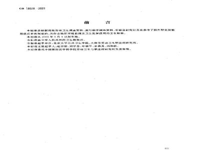 本标准是根据现场劳动卫生调查资料、流行病学调查资料、实验室研究以及在参考了国外职业接触限值后首次制定的,为作业场所环境监测及卫生监督使用的卫生标准。本标准从2002年5月1日起实施。本标准由中华人民共和国卫生部提出,本标准起草单位:北京大学公共卫生学院,大津市劳动卫生职业病研究所。本标准主要起人:赵宗群、刘学恩,叶康平、姜慕真、刘昶庭。本标准委托中国预防医学科学院劳动卫生与职业病研究所负责解释。621