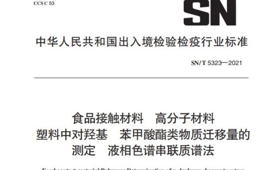 SN/T 5323规定了与食品接触的塑料中对羟基苯甲酸酯类物质迁移量的液相色谱串联质谱测定方法。本文件适用于与食品接触的塑料中3种对羟基苯甲酸酯类物质(参见附录A)迁移量的测定和确证。