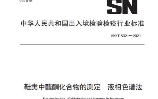SN/T 5321规定了鞋类产品中甲醛、乙醛、丙酮、丙烯醛、丙醛、丁烯醛、丁酮、丁醛、甲基丙烯醛、苯甲醛、戊醛、甲基苯甲醛、环己酮和己醛等醛酮类化合物和总醛酮化合物释放量测定的液相色谱法。本标准适用于鞋类产品中甲醛、乙醛、丙酮、丙烯醛、丙醛、丁烯醛、丁酮、丁醛、甲基丙烯醛、苯甲醛、戊醛、甲基苯甲醛、环己酮和己醛等醛酮类化合物和总醛酮化合物释放量的液相色谱法测定。