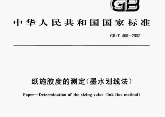 GB/T 460规定了用墨水划线法测定纸施胶度的方法。本标准适用于文化用纸和书写用纸及定量较低的纸。2引用标准