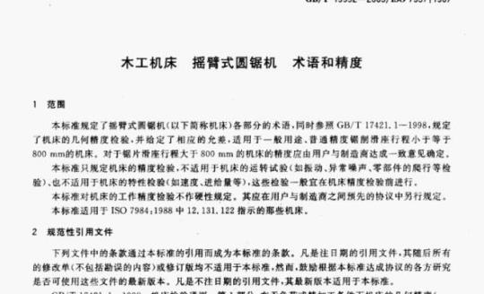 GB/T19992—2005/IS07957:1987木工机床摇臂式圆锯机术语和精度本标准规定了播臂式圆锯机(以下简称机床)各部分的术语,同时参照GB/T17421.1--1998,规定了机床的几何精度检验,并给定了相应的允差,适用于一般用途,普通精度锯削滑座行程小于等于800mm的机床。对于锯片滑座行程大于800mm的机床的精度应由用户与制造商达成一致意见确定。本标准只规定机床的精度检验,不适用于机床的运转试验(如振动,异常噪声,零部件的爬行等检验),也不适用于机床的特性检验(如速度,进给量等),这些检验一般宜在机床精度检验前进行。本标准对机床的工作精度检验不作硬性规定。其应在用户与制造商之间预先的协议中另行规定。本标准适用于ISO7984:1988中12.131.122指示的那些机床。2规范性引用文件