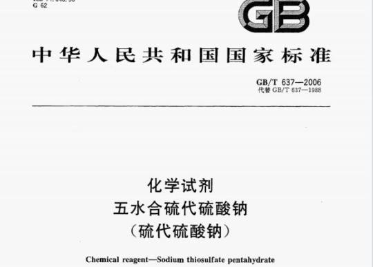 GB/T 637规定了化学试剂冠水含硫优硫酸钠的规格、试验,检验规则和包装及标志。本标准适用于化学试剂f永合梳代硫酸钠的检验。