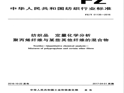 聚丙烯纤维与某些其他纤维的混合物本标准规定了采用化学分析方法测定丙烯纤维二组分混合物含量的方法。FZ/T01135—2016