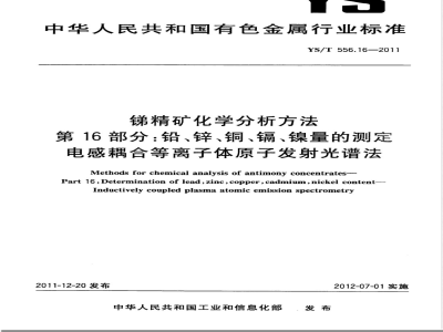 YS/T556的本部分规定了锑精矿中铅、锌、铜、、镍元素的电感耦合等离子体原子发射光谱的测定方法。