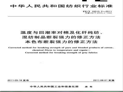 FZ/T10013《温度与回潮率对棉及化纤纯纺、混纺制品断裂强力的修正方法》分为三个部分:本色纱线及染色加工线断裂强力的修正方法;本色布断裂强力的修正方法;