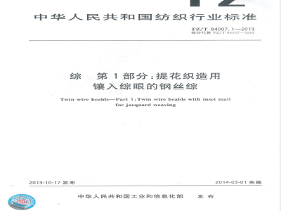 FZ/T94007的本部分规定了提花织造用镶人综眼的钢丝综(以下简称“提花综”)的分类和标记、要求、试验方法、检验规则和包装、标志、储存本部分适用于提花综。