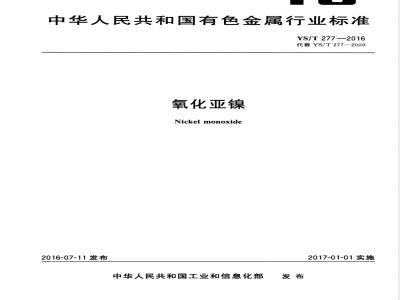 本标准代替YS/T277—2009《氧化亚镍》,与YS/T277—2009相比,主要变化如下:在杂质要求中增加对Cd元素的限值,NiO770、NiO765、NiO760、NiO750四个牌号中的镉含量分别为0.0005%、0.001%、0.0015%、0.002%。-将Co元素的测定方法由“比色法”修改为原子吸收分光光度法”。增加Cd元素的测定方法为原子吸收分光光度法。-对范围和检测规则中部分内容做了修改。-对规范性引用文件进行了调整。本标准由全国有色金属标准化技术委员会(SAC/TC243)提出并归口。本标准起草单位:金川集团股份有限公司、浙江华友钻业股份有限公司、格林美股份有限公司。本标准主要起草人:常全忠、朱永泽、吴亚辉、丁冬久、周良、谢柏华、李智专、邱平。本标准所代替标准的历次版本发布情况为:-YS/T277—1994、YS/T277—2009;GB/T8633-1988。