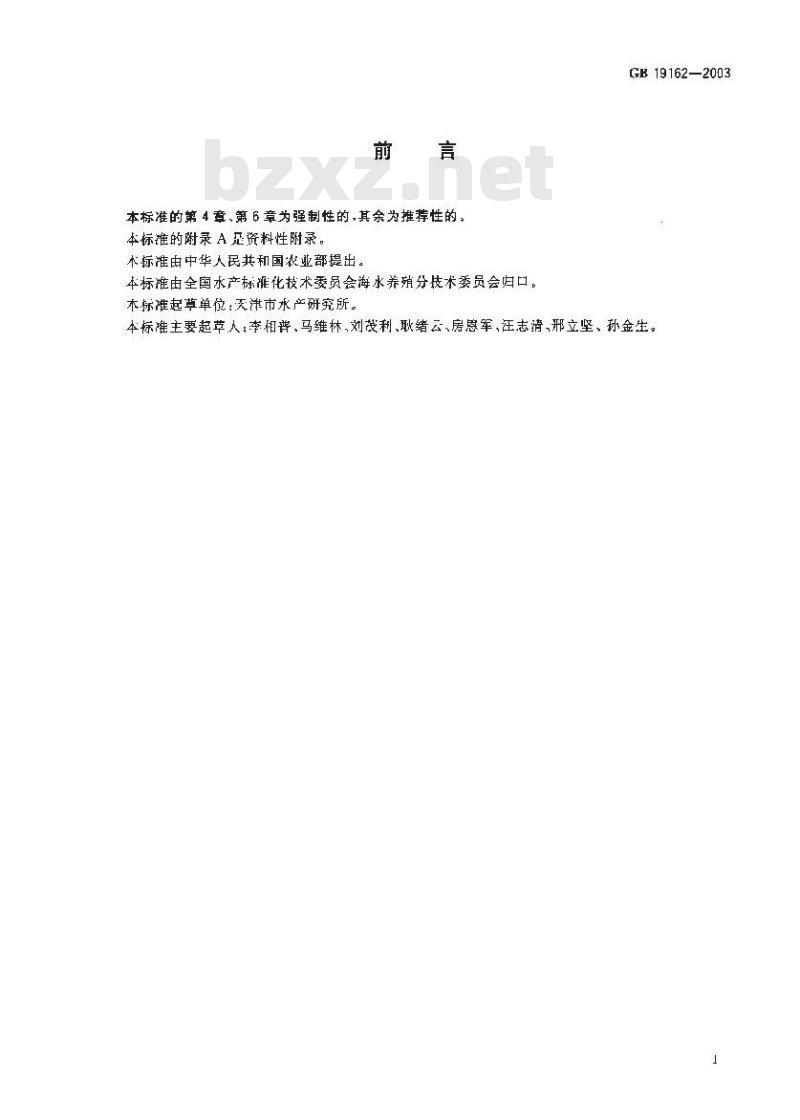 术标准由中华人民共和国农业部提出。本标准由全国水产标准化技术委员会海水养殖分技术委员会归口。本标准起草单位:天津市水产研究所。GB19162—2003