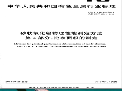 YS/T438《砂状氧化铝物理性能测定方法》共分为5个部分:-第1部分:筛分法测定粒度分布;一第2部分:磨损指数的测定;