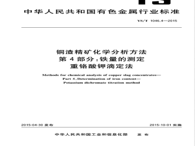 YS/T1046的本部分规定了铜渣精矿中铁量的测定方法。本部分适用于铜渣精矿中铁量的测定。测定范围为23.00%~40.00%。2方法提要