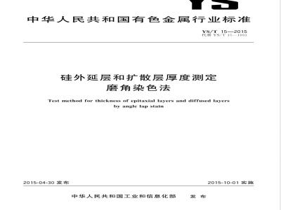 本标准规定了测定硅外延层和扩散层厚度的磨角染色法。YS/T15—2015