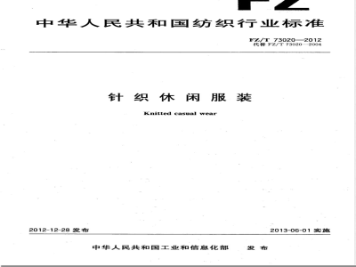 本标准代替FZ/T73020—2004《针织休闲服装》,与FZ/T73020—2004相比主要技术变化如下:删除了对10%以下纤维含量的规定(2004年版4.2.3);细化了表面疵点要求(见4.4.4,2004版4.3.2.1);增加了干洗尺寸变化率、耐干洗色牢度、耐光汗复合色牢度、耐水色牢度、异味、可分解致癌芳香胺染料、拼接互染色牢度、水洗后外观质量、耐唾液色牢度考核项目(见4.3);调整了水洗后扭曲率指标、耐光色牢度指标(见4.3.1,2004版4.2.1);细化了内在质量要求(见4.3.5~4.3.9);细化了对称部位尺寸差异规定(见4.4.6,2004版4.3.4);删除了裙子测量部位示例(图3)(2004版4.3.5.3);修改了成衣测量部位规定表5(见4.4.7.4,2004版4.3.5.4);增加了规范性附录A(见拼接互染程度测试方法);增加水洗后扭曲率试验(见5.2.4)。本标准由中国纺织工业联合会提出。本标准由全国纺织品标准化技术委员会针织品分会(SAC/TC209/SC6)归口。本标准主要起草单位:国家针织产品质量监督检验中心、福建七匹狼实业股份有限公司、李宁(中国)体育用品有限公司、特步(中国)有限公司、安踏(厦门)体育用品有限公司、福建泉州匹克体育用品有限公司、阿迪达斯体育(中国)有限公司、耐克体育(中国)有限公司、国家纺织品服装产品质量监督检验中心(广州)、浙江太子龙服饰股份有限公司、安莉芳(中国)服装有限公司、上海帕兰朵高级服饰有限公司、红豆集团有限公司、福建哥仑步户外用品有限公司、上海三枪集团有限公司、江苏AB集团股份有限责任公司、江苏新雪竹国际服饰有限公司、劲霸(中国)经编有限公司、彪马(上海)商贸有限公司、浙江顺时针服饰有限公司、广东美标服饰实业有限公司、宁波狮丹努集团有限公司、冠华针织厂有限公司。本标准主要起草人:刘凤荣、郭亚莉、徐明明、张宝春、李苏、吴培枝、戴建辉、黄剑萍、高质方、张玉莲、梁敏、曹海辉、方国平、葛东瑛、吴迁平、薛继风、吴鸿烈、王锡良、林冬元、董颖、龚益辉、林声展、郭晓俊、刘晓明。