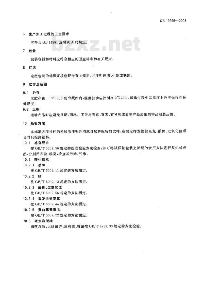 本标准规定了速冻预包装面米食品的指标要求、食品添加剂、生产加工过程的卫生要求、包装、标识、贮存及运输要求和检验方法。本标准适用于以面粉、大米、杂粮等粮食为主要原料,也可配以肉、禽、蛋、水产品、蔬菜、果料、糖、油、调味品等为馅料,经加工成型(或熟制)采用速冻工艺加工包装并在冻结条件下贮存运输及销售的各种面、米制品。 GB 19295-2003 速冻预包装面米食品卫生标准 GB19295-2003 标准下载解压密码:www.bzxz.net