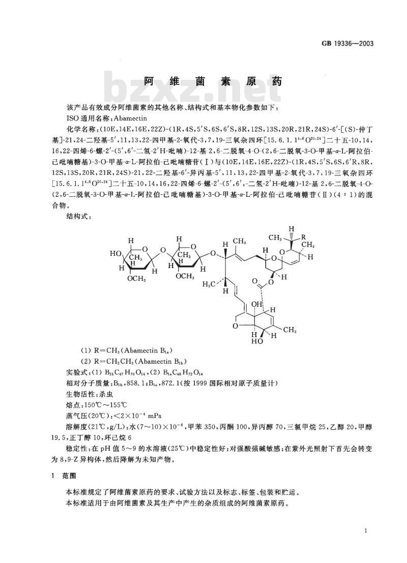 本标准规定了阿维菌素原药的要求、试验方法以及标志、标签、包装和贮运。本标准适用于由阿维菌素及其生产中产生的杂质组成的阿维菌素原药。1bZxz.net