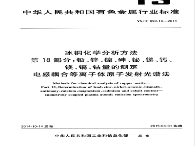 电感耦合等离子体原子发射光谱法Methods for chemical analysis of copper matte-Part 18 : Determination of lead,zinc ,nickel,arsenic, bismuth ,antimony,calcium, magnesium,cadmium and cobalt content-Inductively coupled plasma atomic emission spectrometry2014-10-14发布