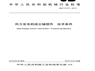 本标准规定了风力发电机组主轴锻件的技术要求、试验方法、检验规则、标志、包装及质量证明书等内容。本标准适用于风力发电机组主轴锻件的订货、制造和检验。
