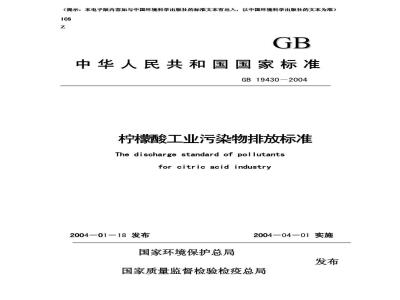 本标准主要有以下特点:1.适用于柠檬酸工业企业水污染物、大气污染物排放管理、噪声污染控制和固体废物处理处置的管理:2.以柠檬酸工业清洁生产工艺及治理技术为依据,确定柠檬酸工业企业水污染物排放标准值:3.现有排放源分阶段执行水污染物排放标准:4.本标准中水污染物排放标准不分级,本标准自实施之日起,代替GB8978-1996《污水综合排放标准》中柠檬酸工业水污染物排放标准部分。