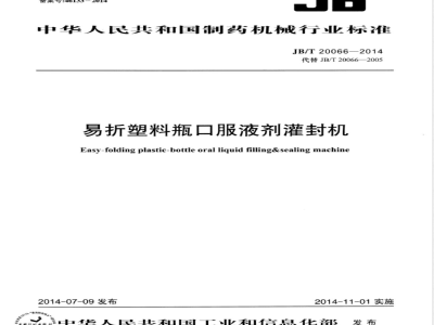本标准按照《药品生产质量管理规范(2010年修订)》、GB28670—2012《制药机械(设备)实施药品生产质量管理规范的通则》的相关要求和GB/T1.1一2009《标准化工作导则第1部分:标准的结构和编写》给出的规则修订。本标准自实施之日起代替JB/T20066—2005《易折塑料瓶口服液剂灌封机》本标准与JB/T20066—2005相比,主要技术内容变化如下:——增加了引用文件:CB/T24342—2009(见第2章);一修改了标记要求(见第3章,2005版第3章);一增加了电气安全中按钮、指示灯和显示器、配线技术等要求(见4.3,2005版4.4);一删除了“灌封机内腔、非不锈钢零件的外表面应做防腐处理”(2005版4.3.2);一增加了“理瓶、理盖、灌装、封口装置应有透明防护罩”(见4.2.2);修改了上盖率(见4.5.2,2005版4.6.3);修改了合格率(见4.5.3,2005版4.6.4);一修改了理盖、理瓶装置的试验方法(见5.4.2,2005版5.4.2);修改了轴承温升、减速器渗漏油试验(见5.4.8,2005版5.5.5);一修改了封盖密封合格率试验(见5.5.5,2005版5.5.4);本标准由中国制药装备行业协会提出。本标准由全国制药装备标准化技术委员会(SAC/TC356)归口。本标准起草单位:江苏永和制药机械有限公司。本标准主要起草人:金源、蒋国华、张玲玲、郁永平。Ⅱ
