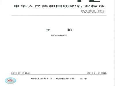 本标准代替FZ/T62003—2006《手帕》,与FZ/T62003—2006相比,主要变化如下:删除了密度偏差率(见2006年版的表1中序号1);增加了蚕丝织物水洗尺寸变化率的试验方法(见6.1.7,2006年版6.1.9);增加了“断裂强力按GB/T3923.1隔距100mm”的要求(见6.1.1,2006年版6.1.2);修改了毛、锦纶、粘纤产品耐洗色牢度的试验方法(见6.1.3,2006年版6.1.4和6.1.5)。本标准由中国纺织工业联合会提出。本标准由全国家用纺织品标准化技术委员会(SAC/TC302)归口。本标准起草单位:江苏省纺织产品质量监督检验研究院。本标准主要起草人:徒晓茜、毛晓舟、唐祖根。本标准所代替标准的历次版本发布情况为:FZ/T62003-—1991、FZ/T62003-—2006。I
