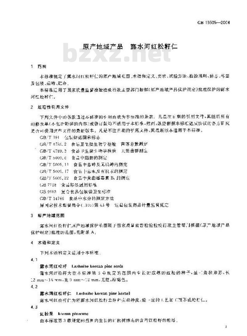 本标准规定了群水红松料仁的原产地或忙压,术谱和龙义、费求,试验方法、检验规则、标点,标签及包装,运箱忙存