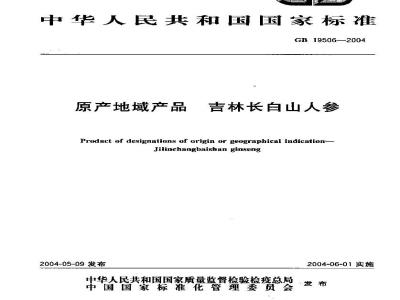 GB/T5009,17食品中总录皮有机汞的测定GB/T18355优质高产人参种植标准GB/T155171人参加工产品分等质量标准模压红参分等质基标准《中华人民共和国药典(一部)(2000年版)3原产地域范国