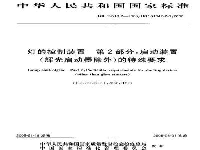 GB 19510.2—2005/1FC:E1347-2-1:200C灯的控制装置,第2部分:启动装置(辉光启动器除外)的特殊要求本部分规定了使压吸1的1000以下交流电源的或光灯和其包放电灯用启动装管(性光启动器缺发誉险外)均特保要求,该店动表置能产生不大」100V的启动脉师并与1EC S0081,IH: 6C1XX,1EC 6IS,IF: F02,IT: 6090I.1EC 61167,(H 1AYY1,C-58-3.(11C.U,G9511等标所益款利镇流,起使用本带分不追用丁辉光启动带或装人放自能启动装胃或人操纵的儿动装置,荧汇灯用预热变器的要求山19510,:给口