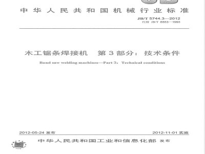 JB/T5744的本部分规定了木工锯条焊接机的一般要求、参数和尺寸、性能、安全卫生、附件和工具、制造质量、空运转试验、负荷试验、精度检验和工作试验。本部分适用于木工带锯条焊接机(以下简称机床)。注:包括电阻焊接机、闪光焊接机、电加热赔铁焊接机及火烧烙铁焊接机等。2规范性引用文件