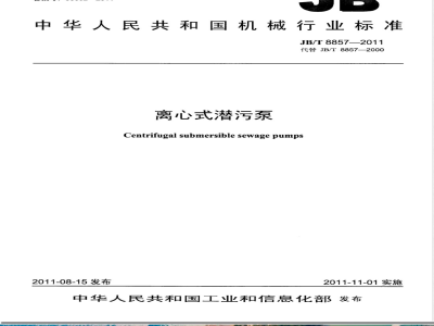 本标准代替JB/T8857-2000《离心式潜污泵》,与JB/T8857—2000相比主要技术变化如下:增加了对所输送介质pH值的要求(本版的5.2c));-增加了对泵潜入水下深度的要求(本版的5.2f));修改了电动机输入功率限值的计算公式(本版的5.4.3);修改了电动机堵转转矩对额定转矩之比、电动机最大转矩对额定转矩之比、电动机堵转电流对额定电流之比的保证值,并增加了单相电动机的相应保证值(本版的5.4.5.2~5.4.5.4);增加了单相电动机效率和功率因素的保证值(本版的表1);修改了电动机电气性能保证值的容差(本版的表2);修改了电动机定子绕组的绝缘等级和温升限值(本版的表3);修改了电动机定子绕组对机壳的冷态绝缘电阻的规定值(本版的5.4.7);增加了对定子绕组重复进行耐电压试验的限制性规定(本版的5.4.9);修改了对密封装置和电动机内腔的气压试验要求(本版的5.5.2.3和5.5.2.4);-增加了对泵连接法兰的要求(本版的5.5.5.2);增加了对匝间冲击耐压试验方法的规定(本版的6.6);-增加了接地标志的出厂检验规定(本版的7.3.2h))。本标准由中国机械工业联合会提出。本标准由全国泵标准化技术委员会(SAC/TC211)归口。本标准起草单位:上海凯士比泵有限公司、浙江新界泵业有限公司、山东颜山泵业有限公司、苏州滨特尔水处理有限公司、上海熊猫机械(集团)有限公司、广州市白云泵业集团有限公司、沈阳水泵研究所。