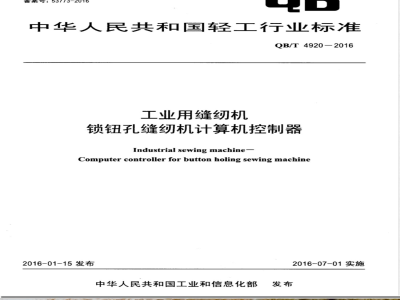工业用缝纫机锁钮孔缝纫机计算机控制器本标准规定了工业用锁钮孔缝纫机计算机控制器的术语和定义、型式、型号和基本参数、要求、试验方法、检验规则和标志、包装、运输、贮存。本标准适用于为工业用锁钮孔缝纫机专门设计的计算机控制器(以下简称“控制器”)。2规范性引用文件