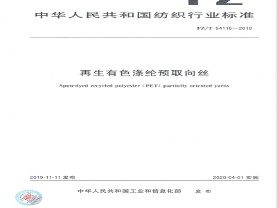 本标准规定了再生有色涤纶预取向丝的术语和定义、产品标识、技术要求、试验方法、检验规则和标志、包装、运输、贮存的要求。