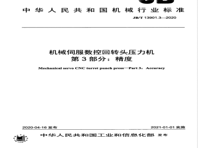 JB/T13901《机械伺服数控回转头压力机》分为三个部分:-第1部分:基本参数;