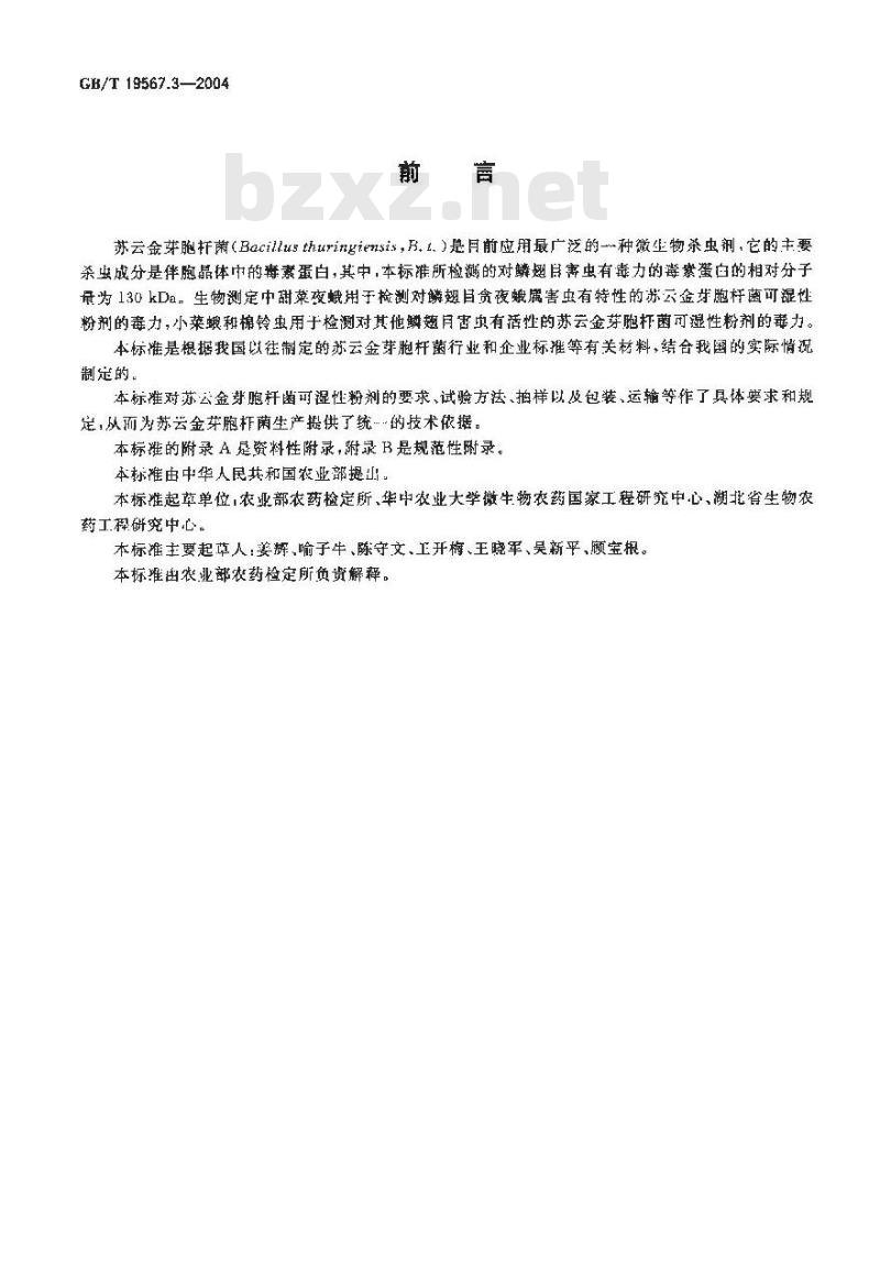 本标准对苏公金身咆杆菌可湿性粉剂的要求、试验方法、拍样以及包装、运输等作了具体要求和规定,从而为苏金芽胞托菌生产提供了统…的技术依据。本标准的附录A资料性附录,附录B是规范性附录。本标准由中华人民共和国农业部提山本标准起草单位农业部农药检定所、华中农业大学微生物农药国家工程研究中心、湖北省生物农药工程研究中心。