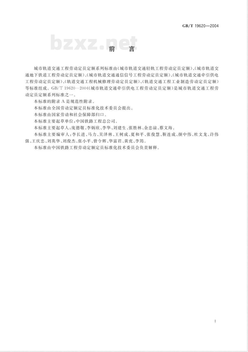 城市轨道交通工程劳动定员定额系列标准由《城市轨道交通轻轨工程劳动定员定额》、《城市轨道交通地下铁道工程劳动定员定额》、《城市轨道交通通信信号工程劳动定员定额》、《城市轨道交通牵弓供电工程劳动定员定额》、《轨道交通工程机械修理劳动定员定额》、《轨道交通工程工业制造劳动定员定额》等标准组成。GB/T19620一2004《城市轨道交通牵弓供电工程劳动定员定额》是城市轨道交通工程劳动定员定额系列标准之一。