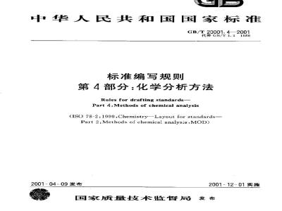 GB/T20001的本部分规定了编写化学分析方法标准的格式和表述规则。GB/T20001.42001