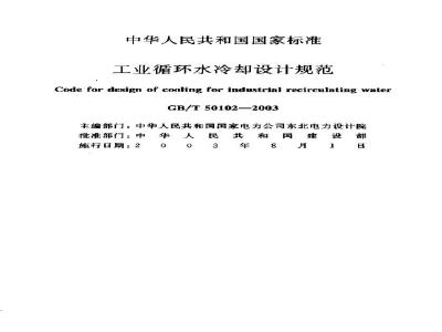 《工业循环水冷却设计规范》的公告现龍雅业还水冷耀设计规范为家标,编学为G3/T50102-2003,自2003年8月1月起实施原《工业循环水玲御设计规范》GBI102-87尚时废止。本规范由建设部标雅定额研究所组织中国计划山版社出版发行