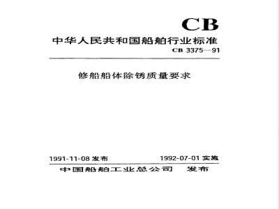 本标准规定了修船船体表面原始锈蚀等级及以喷射除锈、手工、动力工具除锈以及机械打磨除锈方法进行修船船体表面除锈的目视质量评定等级和评定方法。本标准适用于各种钢质营运船舶船体部分的除锈质量评定。 CB 3375-1991 修船船体除锈质量要求 CB3375-1991 标准下载解压密码:www.bzxz.net