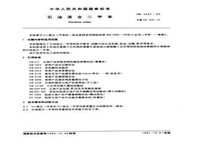 3.13℃混合二甲苯和5℃混合二甲苯均按质量分为优级品和一级品。3.2石油混合二甲苯的质量指标及试验方法见下表。国家技术监督局1990-12-30批准1991-10-01实施