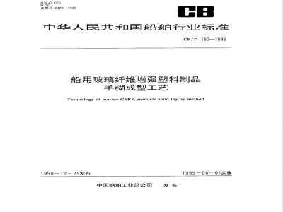 CB/T 180-1998 船用玻璃纤维增强塑料制品 手糊成型工艺 CB/T180-1998 标准下载解压密码:www.bzxz.net