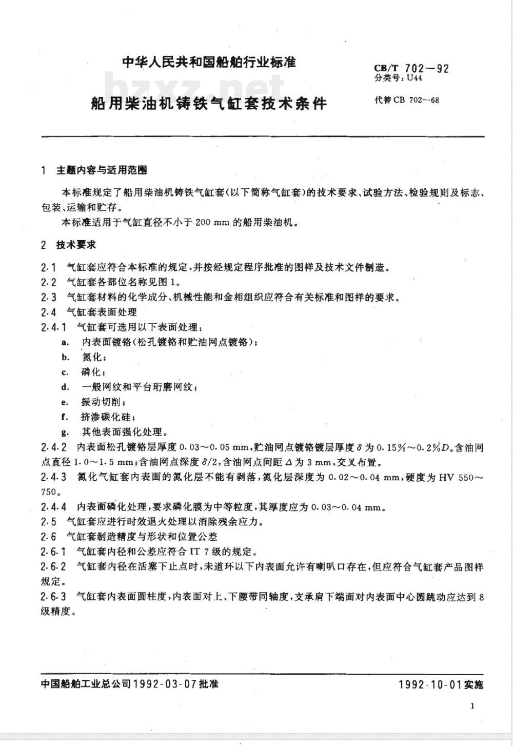 本标准规定了船用柴油机铸铁气缸套的技术要求、试验方法、检验规则、运输、标志、包装及贮存。本标准适用于气缸直径不小于200mm的船用柴油机。 CB/T 702-1992 船用柴油机铸铁气缸套技术条件 CB/T702-1992 标准下载解压密码:www.bzxz.net