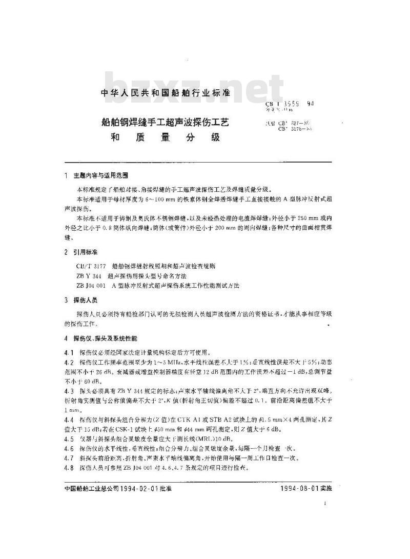 CB/13177船舶钢焊缝射线照期和超波检查规购ZBY344超卢探伤用探头型马命名方法ZBJ04001A型脉冲反射式超声探伤系统工作性能测试厅法3探伤人员