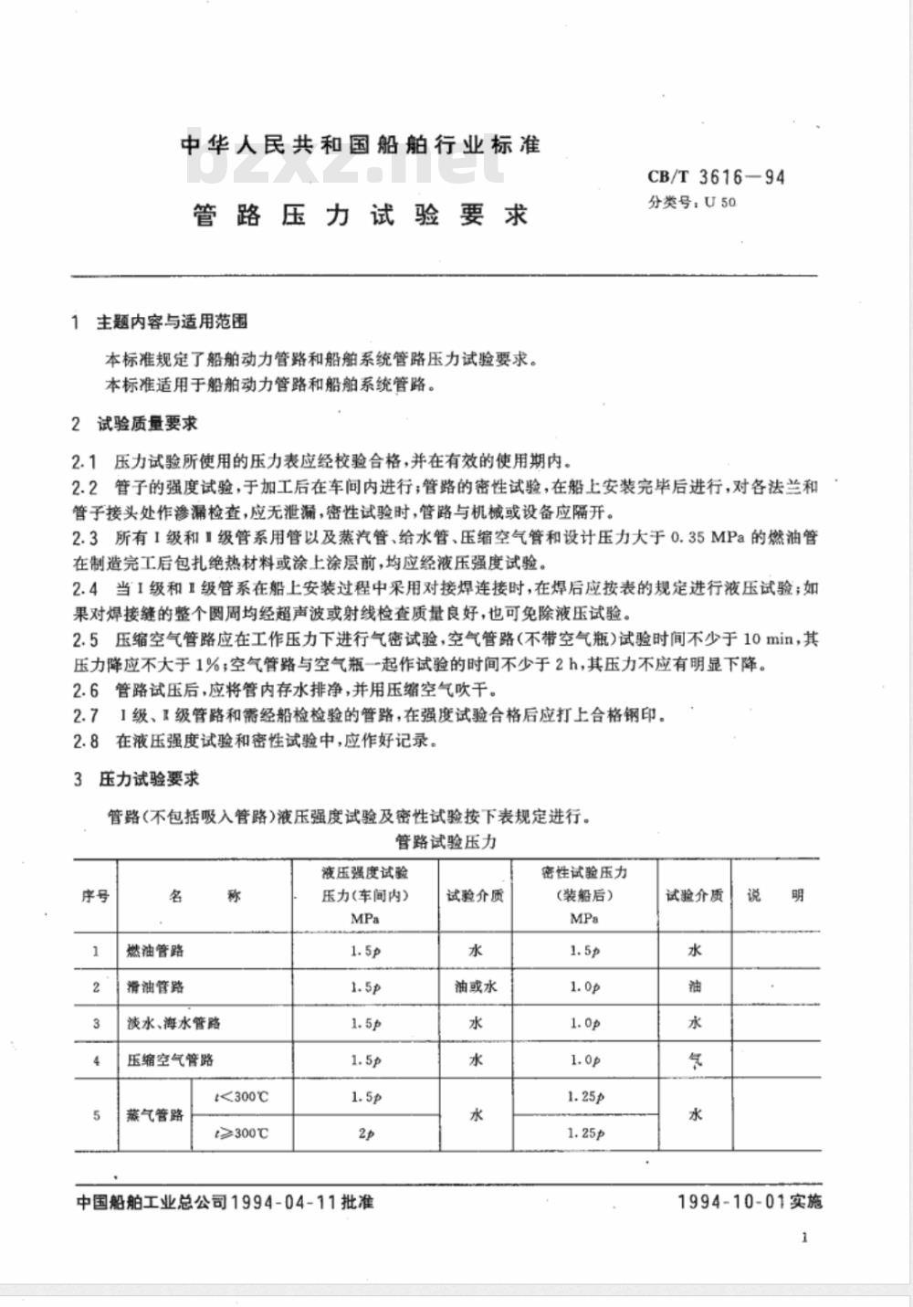 本标准规定了船舶动力管路和船舶系统管路压力试验要求。本标准适用于船舶动力管路和船舶系统管路。2试验质量要求