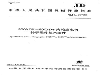 本标准代替JB/T7178——1993《300-600MW汽轮发电机转子锻件技术条件》本标准与JB/T7178-—1993相比主要如下:标推增加了前言: