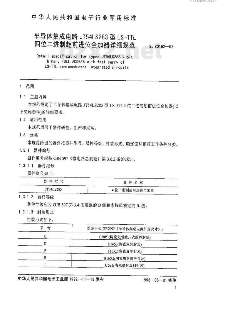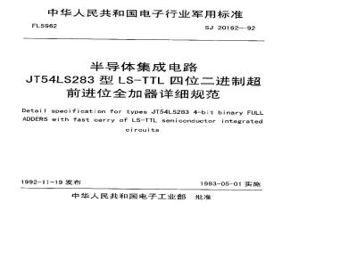 中华人民共和国电子工业部批准中华人民共和国电子行业军用标准半导体集成电路JT54LS283型LS-TTL四位二进制超前进位全加器详细规范Detail specification for types JT54Ls283 4-bitbinary FULL ADDERS with fast carry ofLS-TTL semiconductor integrated circuits1范围