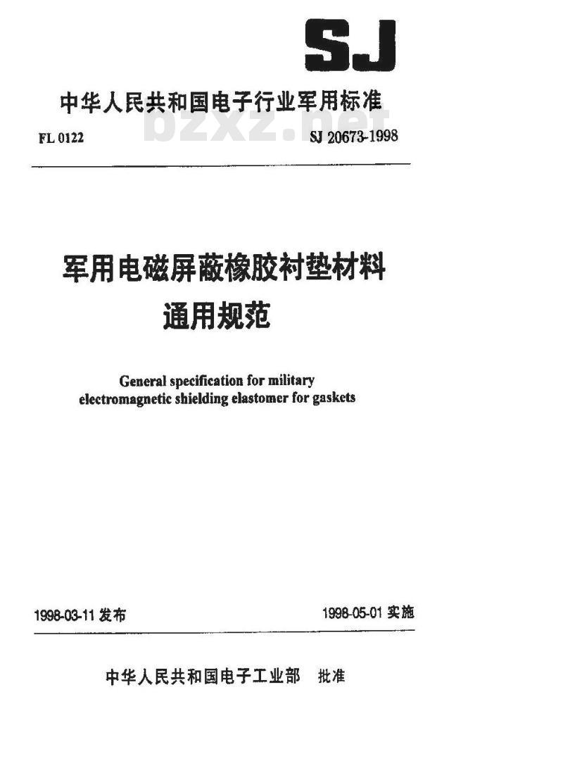 中华人民共和国电子行业军用标准军用电磁屏蔽橡胶衬垫材料通用规范General specification for militaryelectromagnetic shielding elastomer for gaskelsSJ 20673 -- 1998