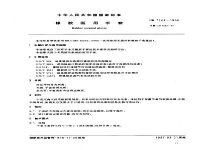 本标准规定了医疗手术用橡胶手套的技术要求及抽样方法。本标准适用于天然胶乳制成的医用手套。 GB 7543-1996 橡胶医用手套 GB7543-1996 标准下载解压密码:www.bzxz.net