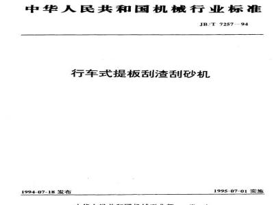 本标准规定了平流沉砂池用行车式提板刮渣刮砂机(以下简称提刮机)的型号、规格及基本参数,技术要求,试验方法与检验规则,标志、包装、运输、贮存,本标准适用于污水处理工程中矩形沉砂池,初沉池,用以刮除池底沉砂(泥)和表面源浮物的行车式提板刮渣刮砂机。