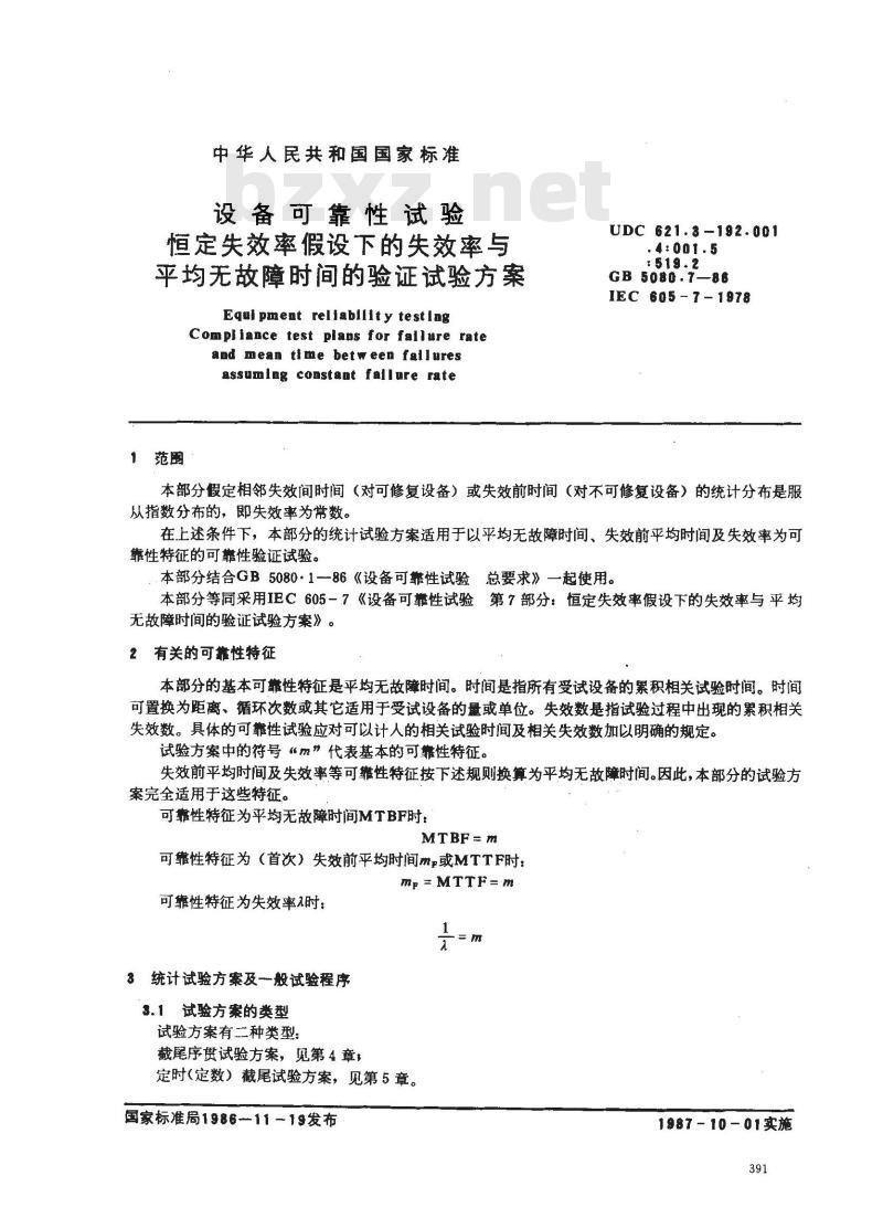 本部分假定相邻失效间时间(对可修复设备)或失效前时间(对不可修复设备)的统计分布是服从指数分布的,即失效率为常数。 GB 5080.7-1986 设备可靠性试验 恒定失效率假设下的失效率与平均无故障时间的验证试验方案 GB5080.7-1986 标准下载解压密码:www.bzxz.net