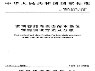 本标准规定:a)玻璃容器在经受121±1℃水侵蚀60±1min内表面耐水性的测定方法。耐水性是通过用盐酸溶液滴定制备好的、一定量的淬取液求得的。此时,容器的耐水性与所消耗盐酸成反比。B)玻璃容器的分类。此分类是根据本标准所规定的玻璃容器内表面耐水性的测定方法而定的。注:滴定法规定的玻璃容器耐水性HC级与根据ISO 4802-2获得的HC级具有可比性,尽管两种方法的个别试验结果会不同。本标准适用于一般玻璃瓶、小玻璃瓶、安瓿、烧瓶和烧杯等玻璃容器。这些玻璃容器是用经过表面处理或未经表面处理的钠钙玻璃、硼硅酸盐玻璃或中性玻璃制成的。本标准不适用于双联安瓿。 GB/T 4548-1995 玻璃容器内表面耐水侵蚀性能测试方法及分级 GB/T4548-1995 标准下载解压密码:www.bzxz.net