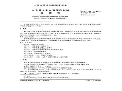 IEC326-5是有金属化孔单双通印制板的IEC标推,下面的文件包含该IFC标准,以及准备按欧电工标准化委员会(CFAEI.FC)电子元器件质量评定体系评定的印制板所必需的补充标准,这些标准均与GB/T16261-~1996&印制板总规范》一致。1.1范围和月的