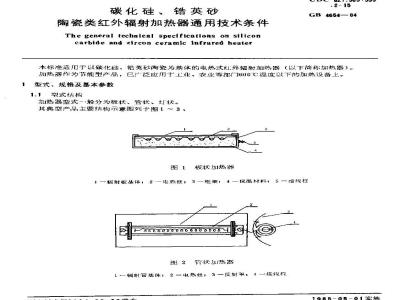 本标准适于以碳化硅,错英砂陶瓷为基体的电热式红外辐射加热器(以下简称加热器)。加热器作为节能型产品,已广泛应用于上业、农业等部门600℃温度以下的加热设备上。型式、规格及基本参数